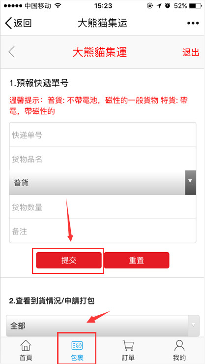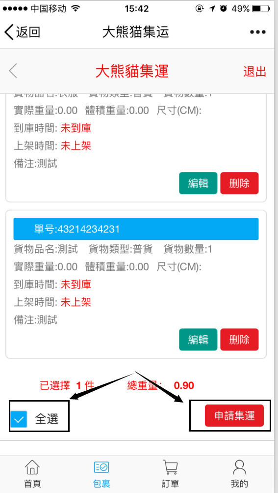 第五步:快遞到達集運倉后,集運系統(tǒng)會主動通知您可進行申請打包