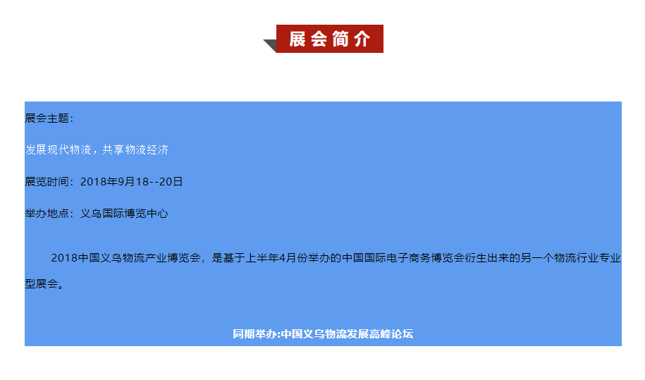 2018中國義烏物流產業博覽會,是基于上半年4月份舉辦的中國國際電子商務博覽會衍生出來的另一個物流行業專業型展會。